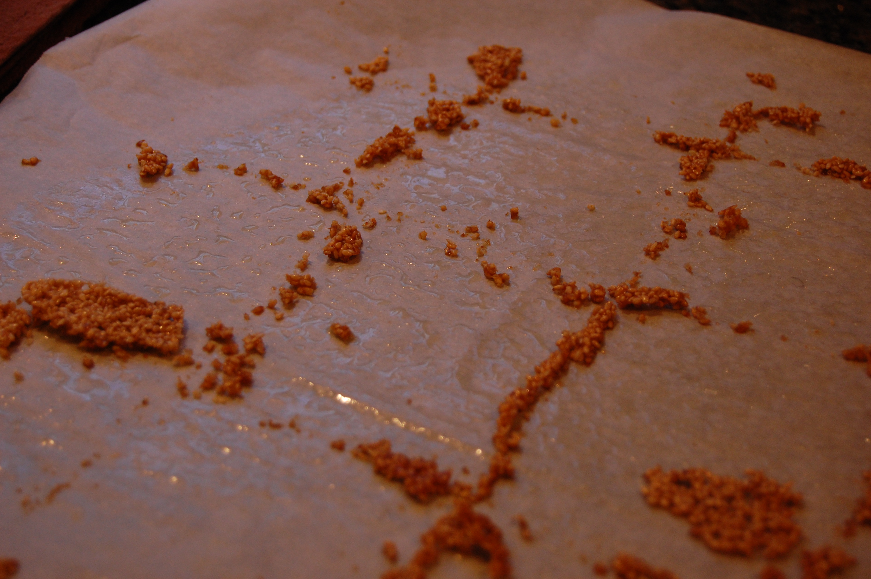 First, they are so simple to make. Just simmer in a medium saucepan a few ingredients that you probably already have in the pantry. Stir in a big bowl of sesame seeds (stock up on sesame seeds at Whole Foods or in the bulk bin next time you’re at the grocery store and pop them in the freezer – that way you can whip these up whenever the mood strikes), spread on parchment lined pans and bake. Easy.