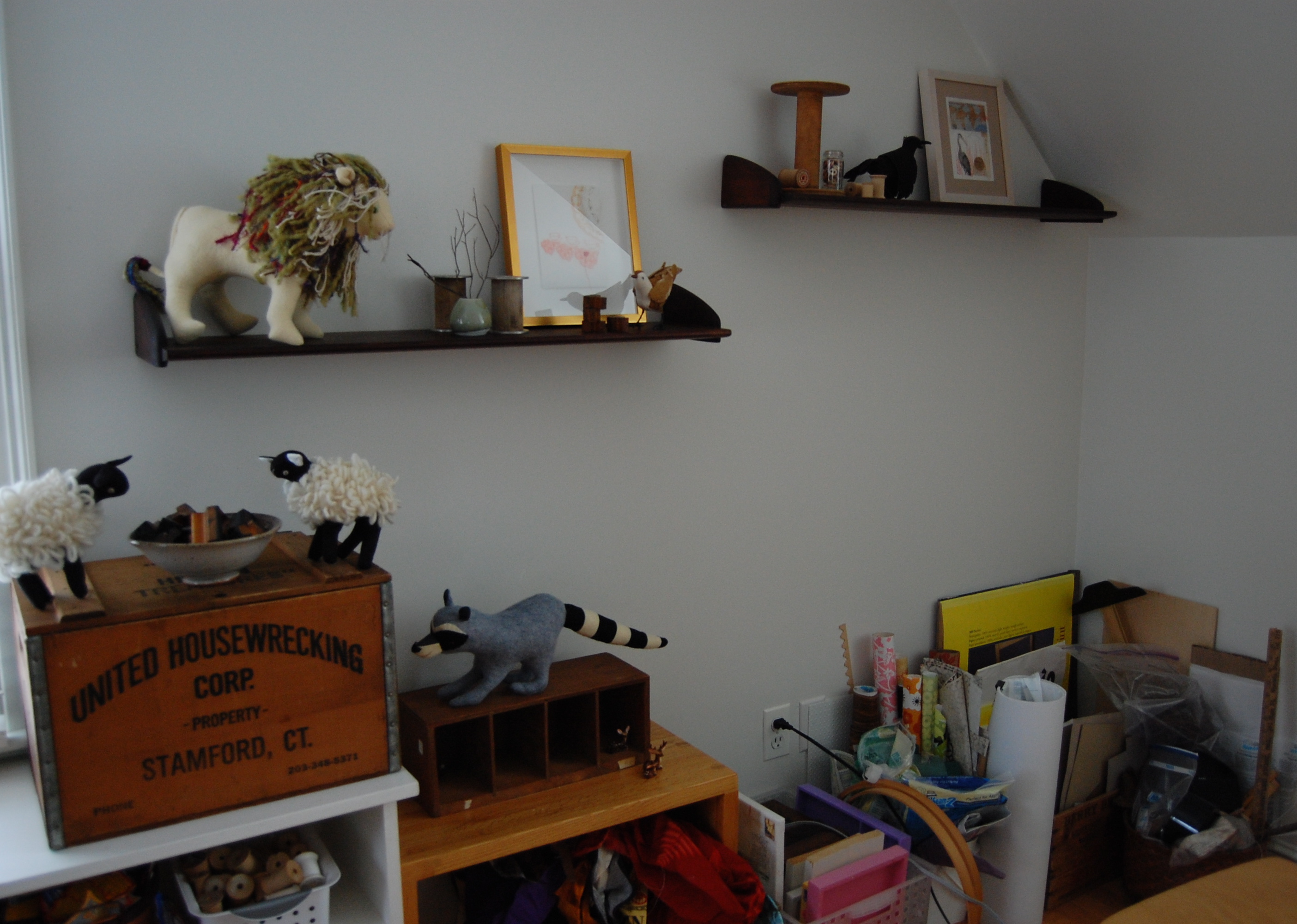 Last week we hung up two beautiful mid-century shelves we found on Craigslist. Finally a place to display things.