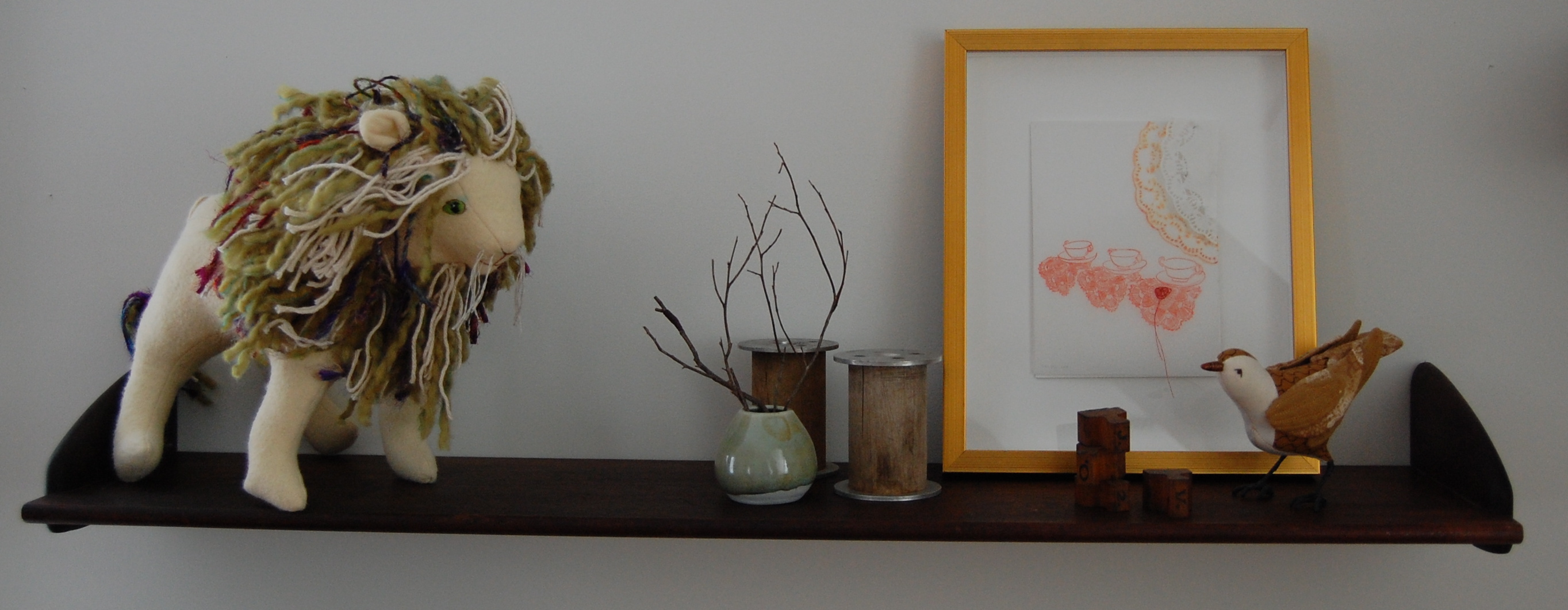 On the lower one I put my lion, some vintage spools, a little vase with some bare branches, vintage wooden alphabet stamps, a bird, and a collage Lisa Solomon gave me in a swap a year or two ago.