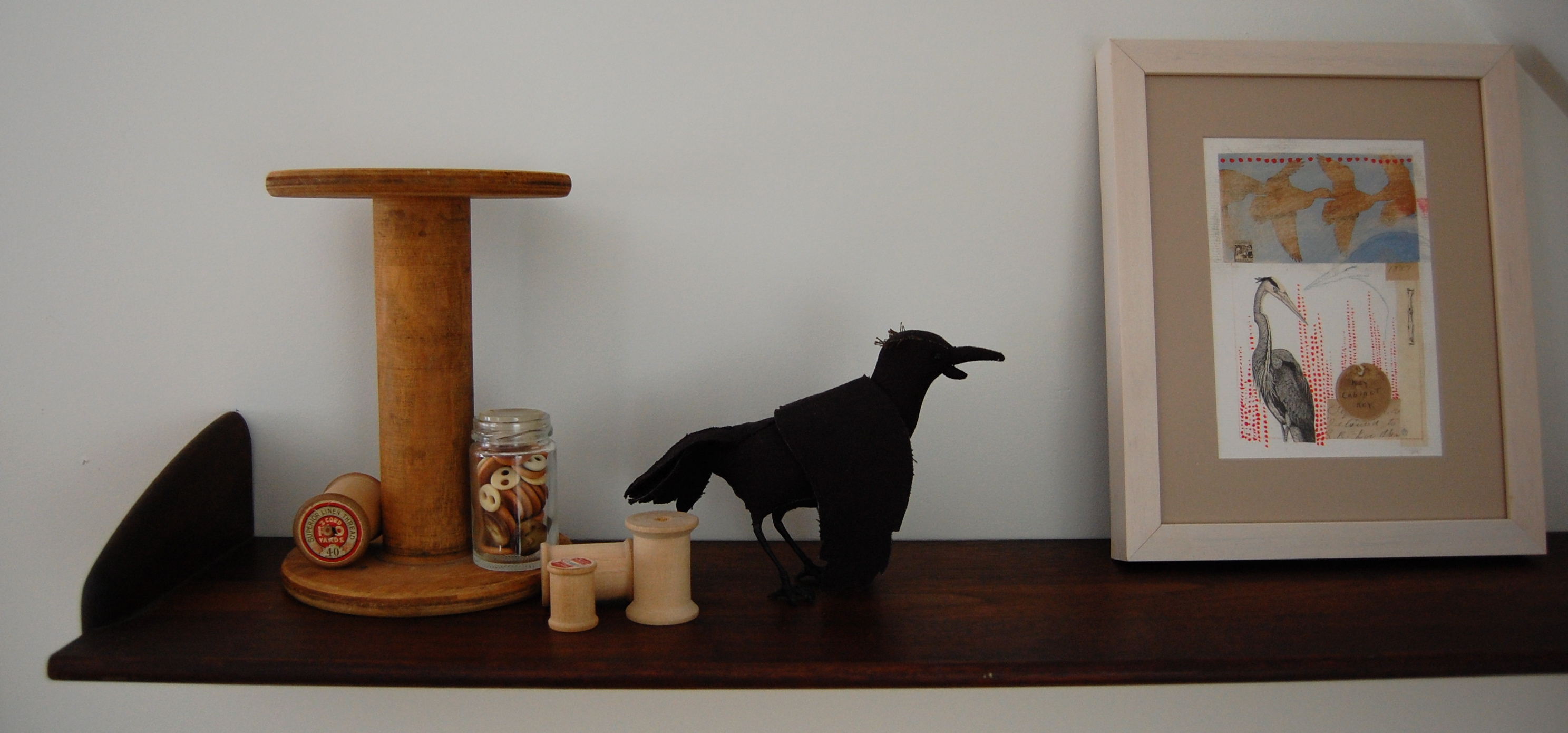 And on the other, more wooden spools, wooden and bone buttons, a crow and a collage I bought at Three Graces in Portsmouth last summer.