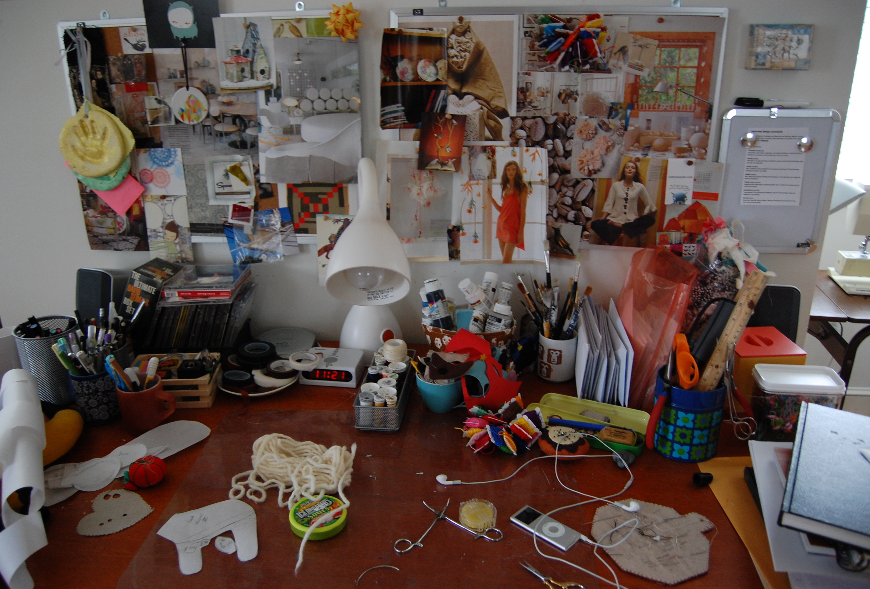 My desk today. Pattern pieces, scissors, forceps, needles, beeswax, embroidery floss, candy and general detritus.