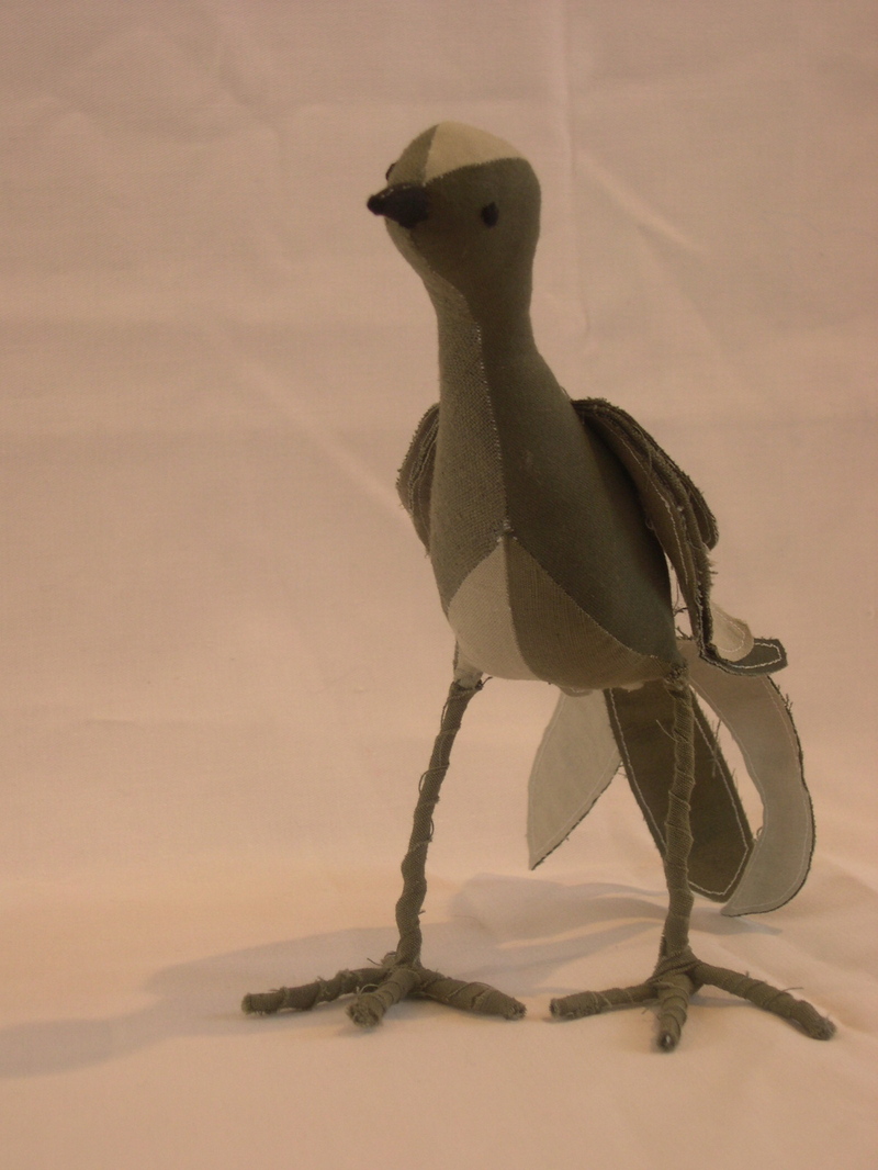 This was so much fun. To create a bird entirely from gray fabrics I dyed myself. The contrasting textures of different grades of linen and muslin. The different shades of gray each one became when immersed for a short time in black dye. Combining them together to create this inquisitive little fellow. Sheer pleasure for me.