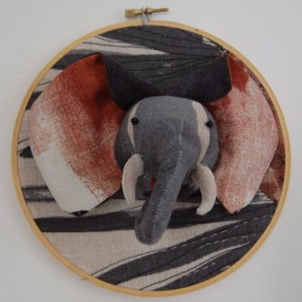 A new embroidery hoop project. Sweet little elephant face smiling at you. Backdrop is a vintage Vera linen napkin stretched across an 8" diameter embroidery hoop.