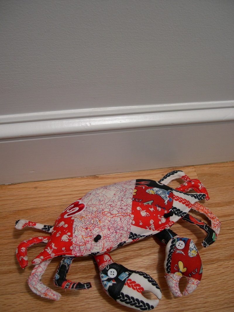 This guy was a perfect way to use up one my favorite pieces of vintage fabric – the black and red chains. I only had a tiny piece and it is all gone now. I decided to make his big claws movable by using a gusseted button joint. Pretty cool stuff. Basically the upper piece of the claw is inserted between two flaps in the lower piece and held there by a button on each side. This allows the lower claw to move freely. I figured out how to do this from this page