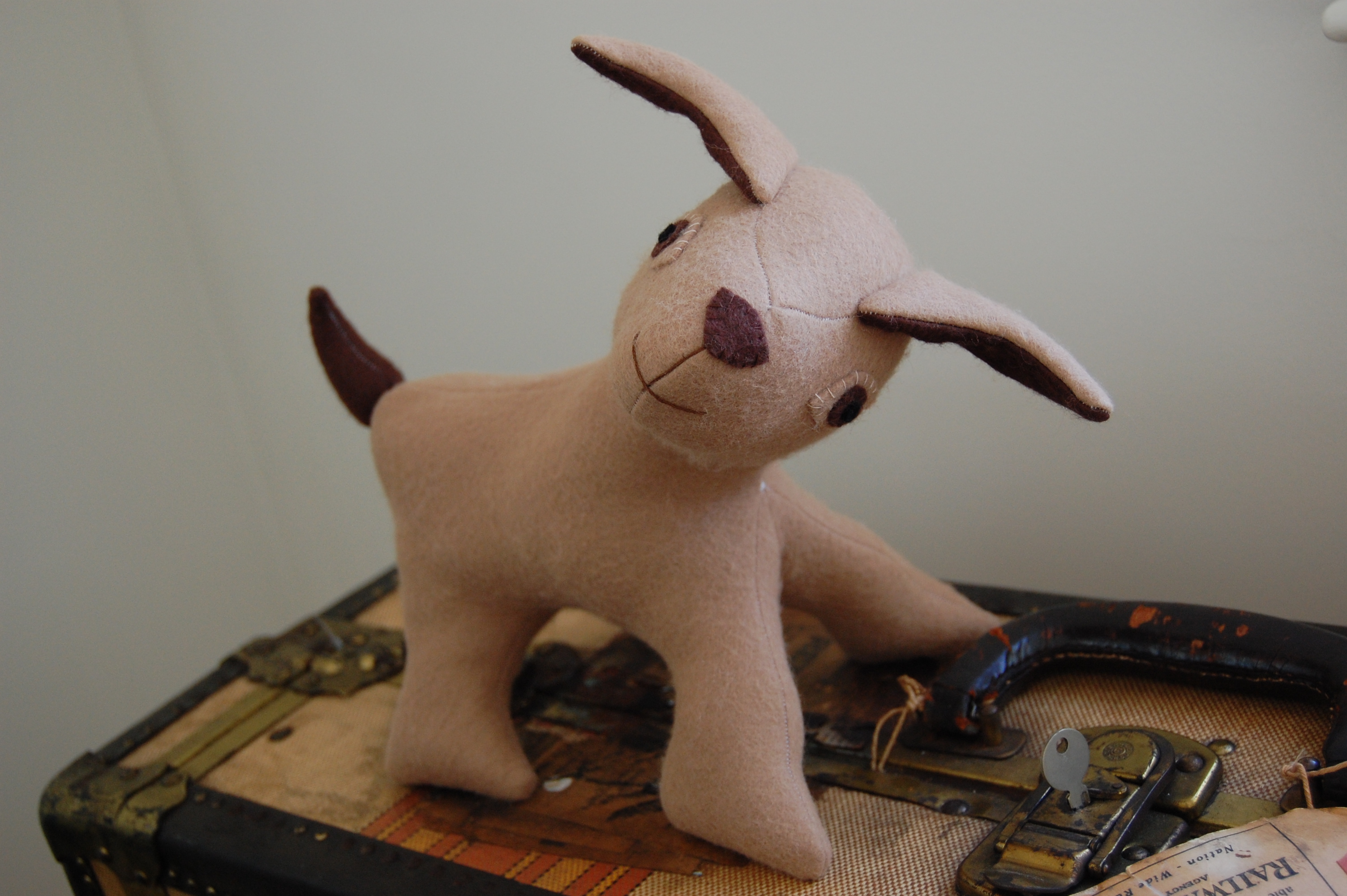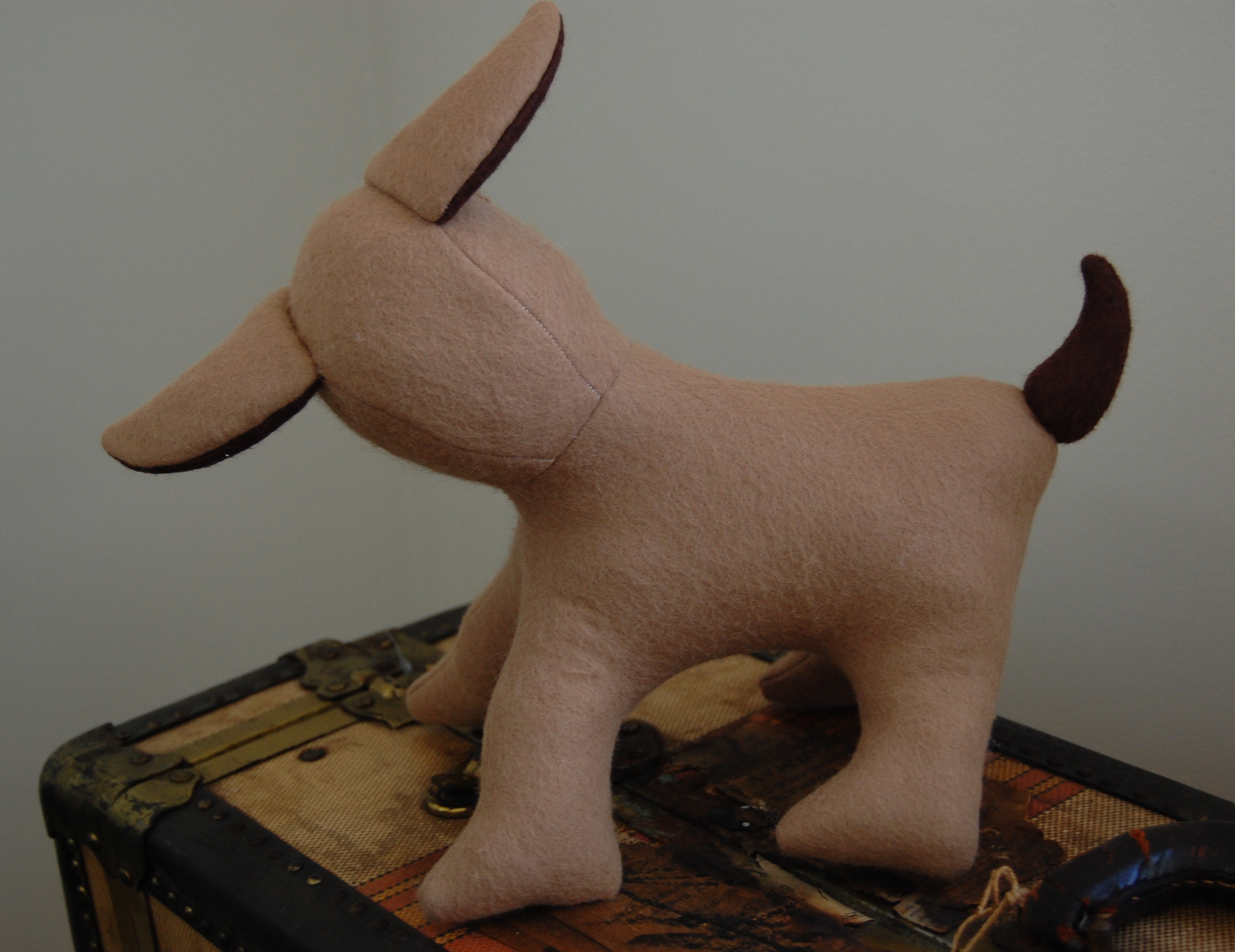 I am interested in thinking about the pattern design elements that make a soft object a cuddly toy versus a more austere sculptural piece. Baby-like features are key, I think, to an appealing toy. Big eyes and a big round head like a toddler. I designed this cuddly dog as a way to experiment with these ideas.