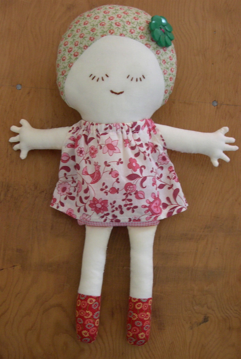 I finished a third doll during nap time today (everyone is taking a nice long nap right now – thank god for the summer sun and the pool!). Two of these dolls will be off next week to Seattle for Plush You, I just have to choose which ones I’m willing to let go. I like making these dolls because each one requires four different prints and a vintage button. I get so much joy from sorting through my big bins and matching fabrics together, especially when I use up a tiny scrap of treasured fabric that I’ve held onto for years even though it is so small .