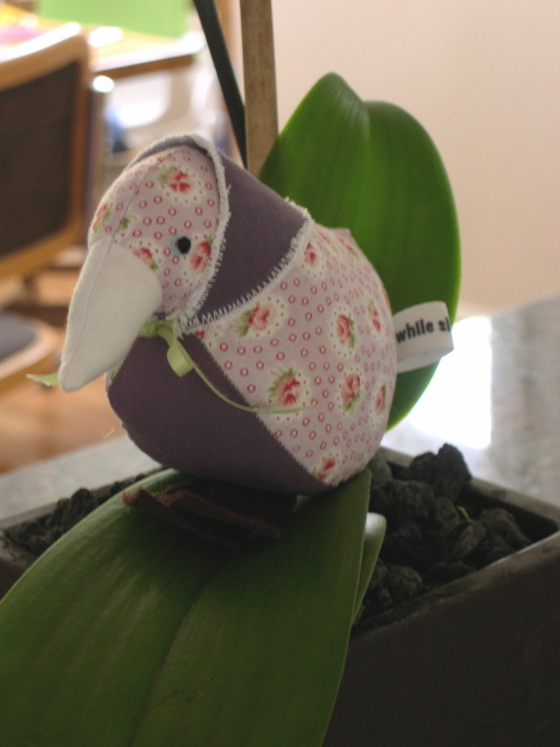 A few new creatures for the charity auction – this little bird in purple with a scarf around her head
