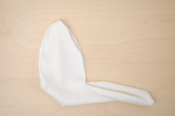 Use that body template to cut one body piece from white fabric. Then fold it up (see step 4 above)and sew the petals together. If you imagine a tulip that’s all closed up, that’s the way this bunny’s body comes together.