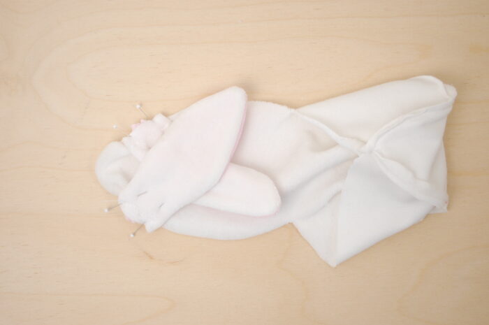 3. Place the ears pink side down on the right side of the body piece as marked. Pin in place.