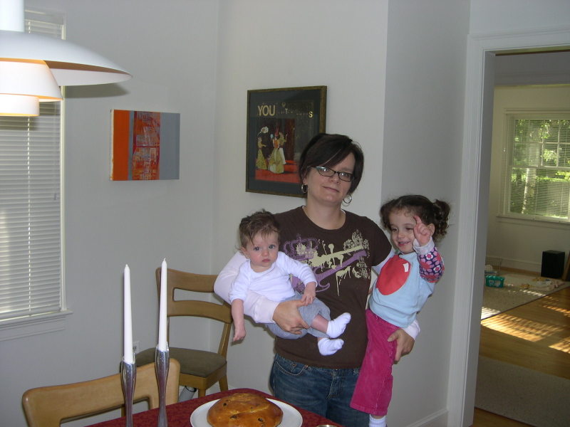 We had a lovely Rosh Hashanah. Friday Charlie came home from work early and we baked the challah and set the table. The challah with saffron and golden raisins was just lovely. I think this picture of me and my two girls Friday afternoon fairly well captures my life right now trying to raise two babies and hold it all together