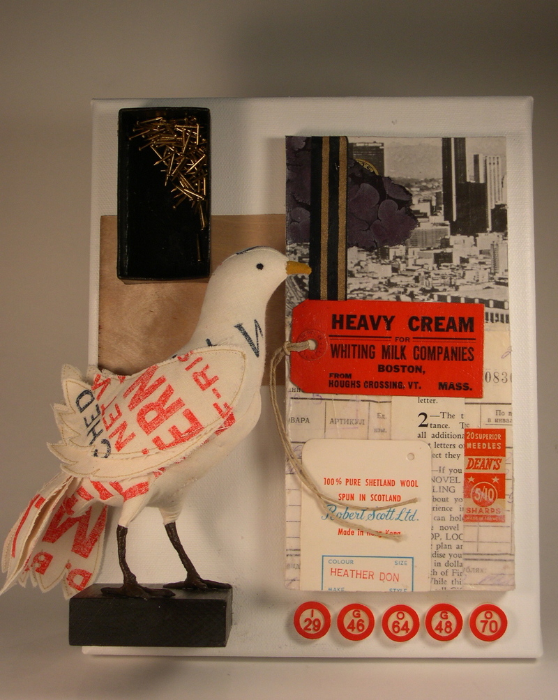 (wood, ephemera, wire, matchbox, nails, flour sack)