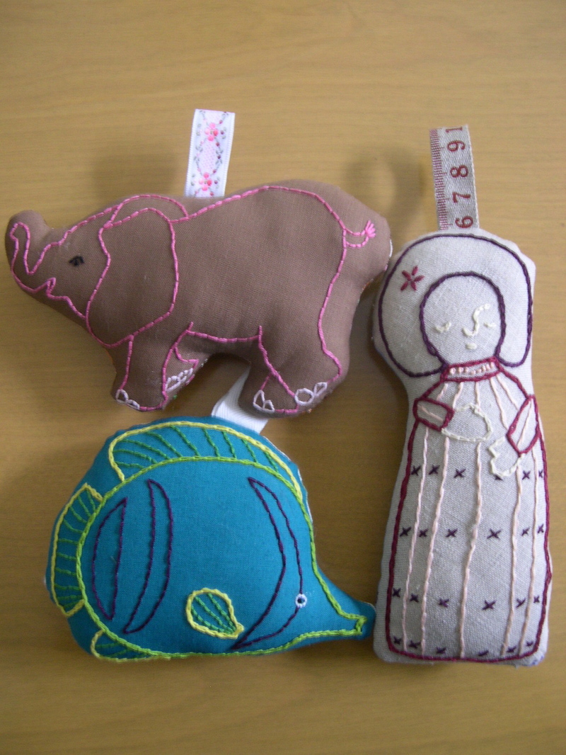 Of course I immediately felt so paralyzed creatively. What will I make? How will it all tie together? And I still have upcoming shows to get ready for and Magpie, too. So in an effort to clear my head, I’m clearing projects off my desk. Last night I finally stuffed and sewed up the last of the beach embroideries made during our vacation – that’s a fish an elephant (both drawn from some of Roxy’s favorite plastic toys) and a Byzantine-style lady