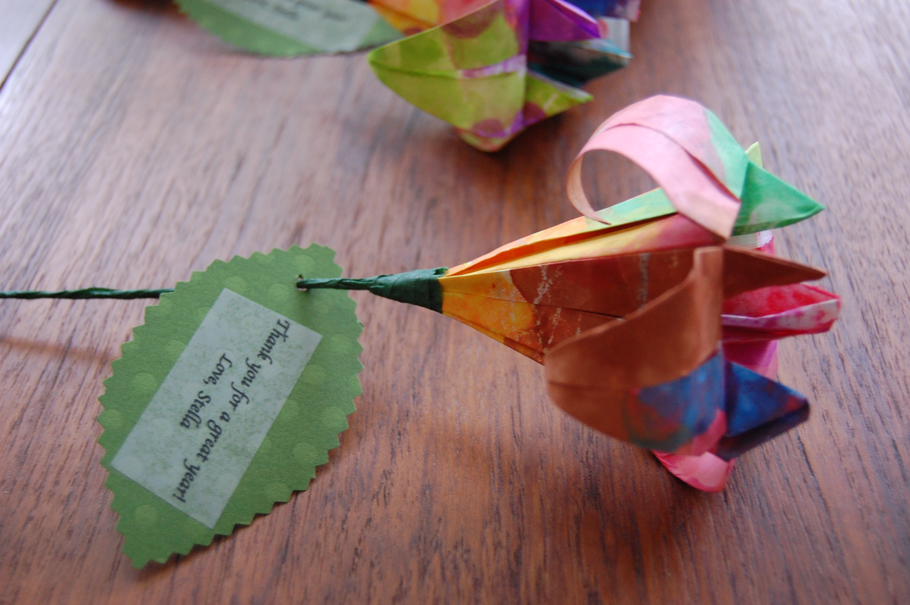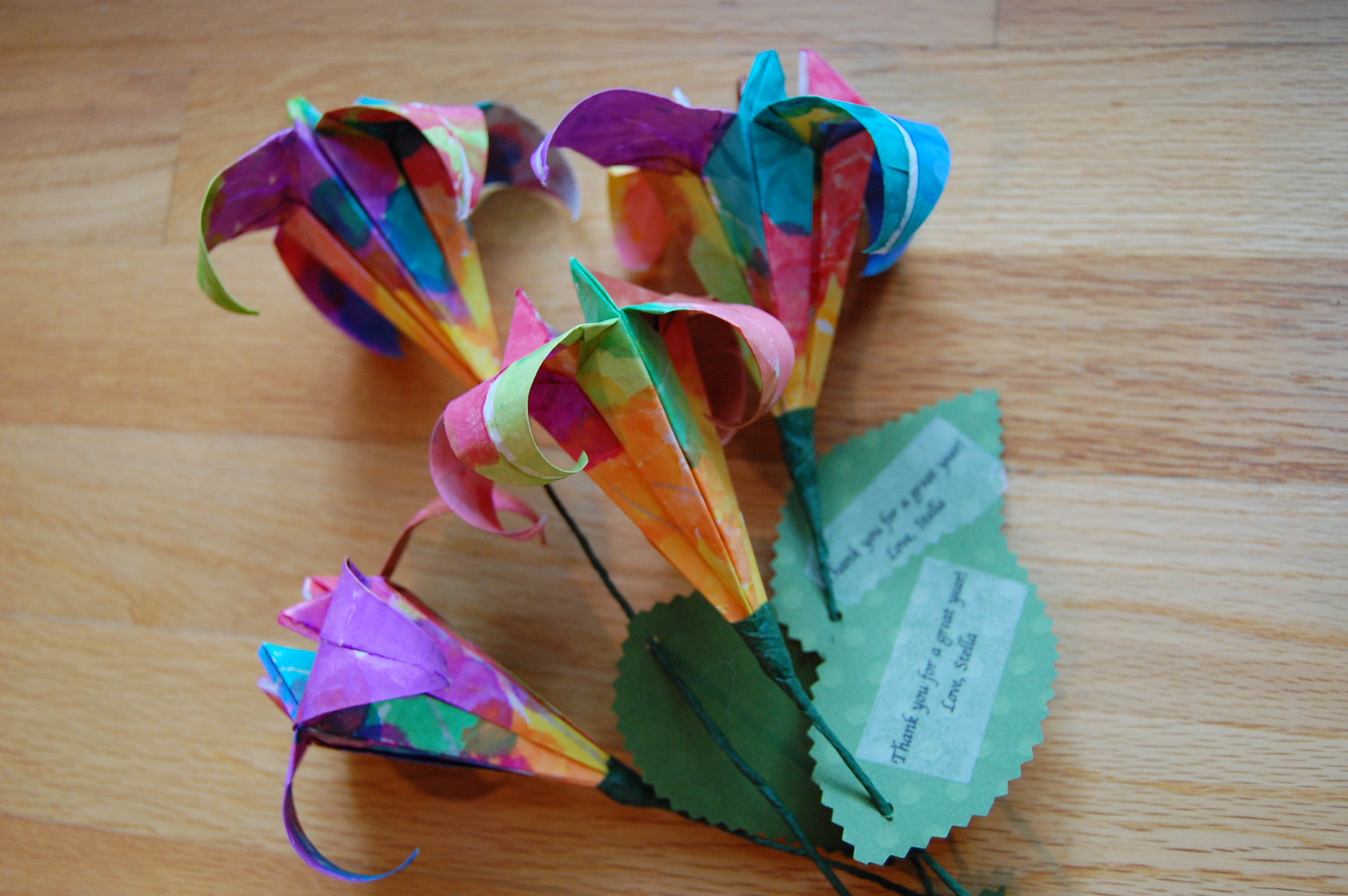 Yesterday afternoon Stella and I spent about an hour making some paper lilies for her teachers as an end of the year gift. Stella was very excited about this project. She has four teachers who work in her classroom so we made four flowers.