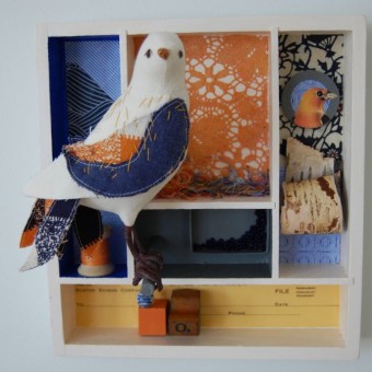 "Gathering"mixed media shadow box with soft sculpture bird8" x 8" This shadow box will be for my show at Lark & Key opening in May.  I haven't worked on a shadow box for a long while and it was really pretty fun to do.  And the orange and blue and gray – I'm still enjoyingRead More →