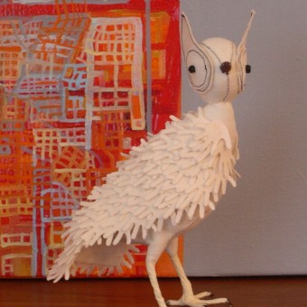 A new bird. Her wings are made from tiny hands.  The painting in the background is by Brigid McCabe. And a little owl from my sketchbook. I like his face.