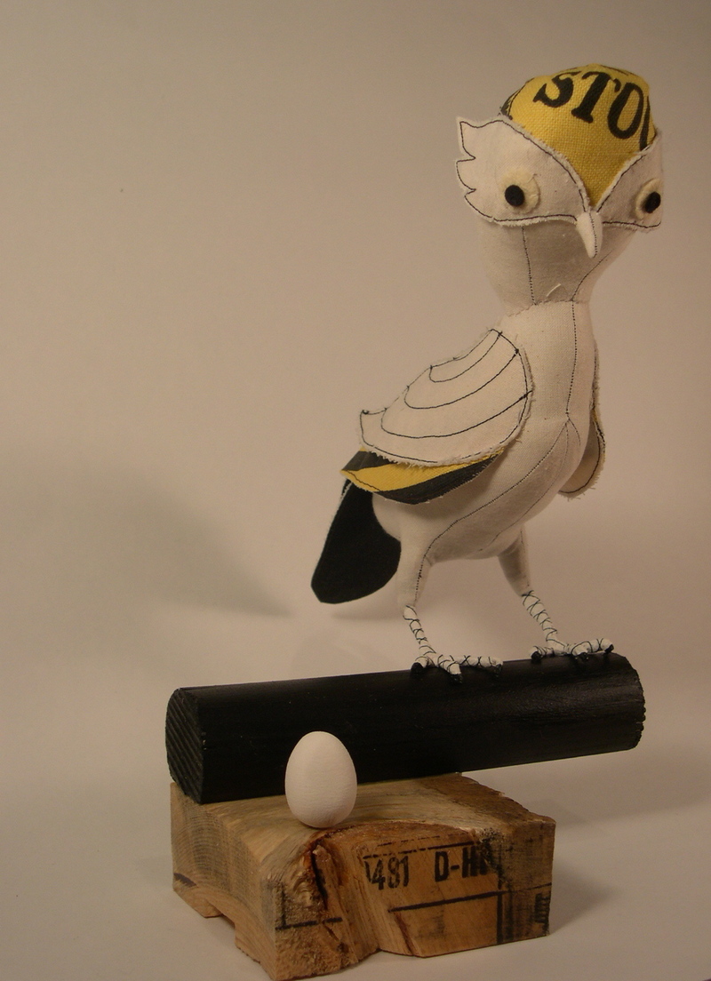 (Guinness bar towel, muslin, wire, polyfill, floral tape, acrylic paint, Paperclay, scrap wood)