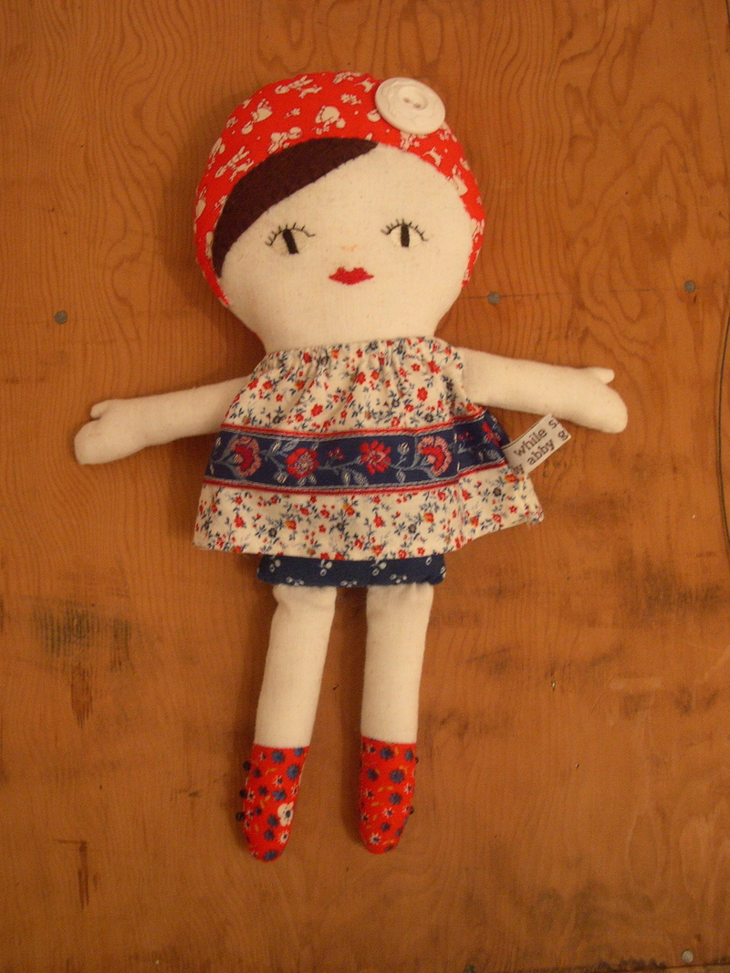 Another day of reworking things. Here is the original look of this doll, but since making it I learned so much from Mimi about how to embroider that the original face was no longer okay with me. Today I took out the embroidery on her face and gave her some new features along with a bit of brown wool felt hair peeking out from under her cap. I feel better about her now. Tomorrow she will be on her way to Magpie in Davis Square, Somerville, along with seven other pieces. I feel good knowing she is going off into the world with her eyes open.
